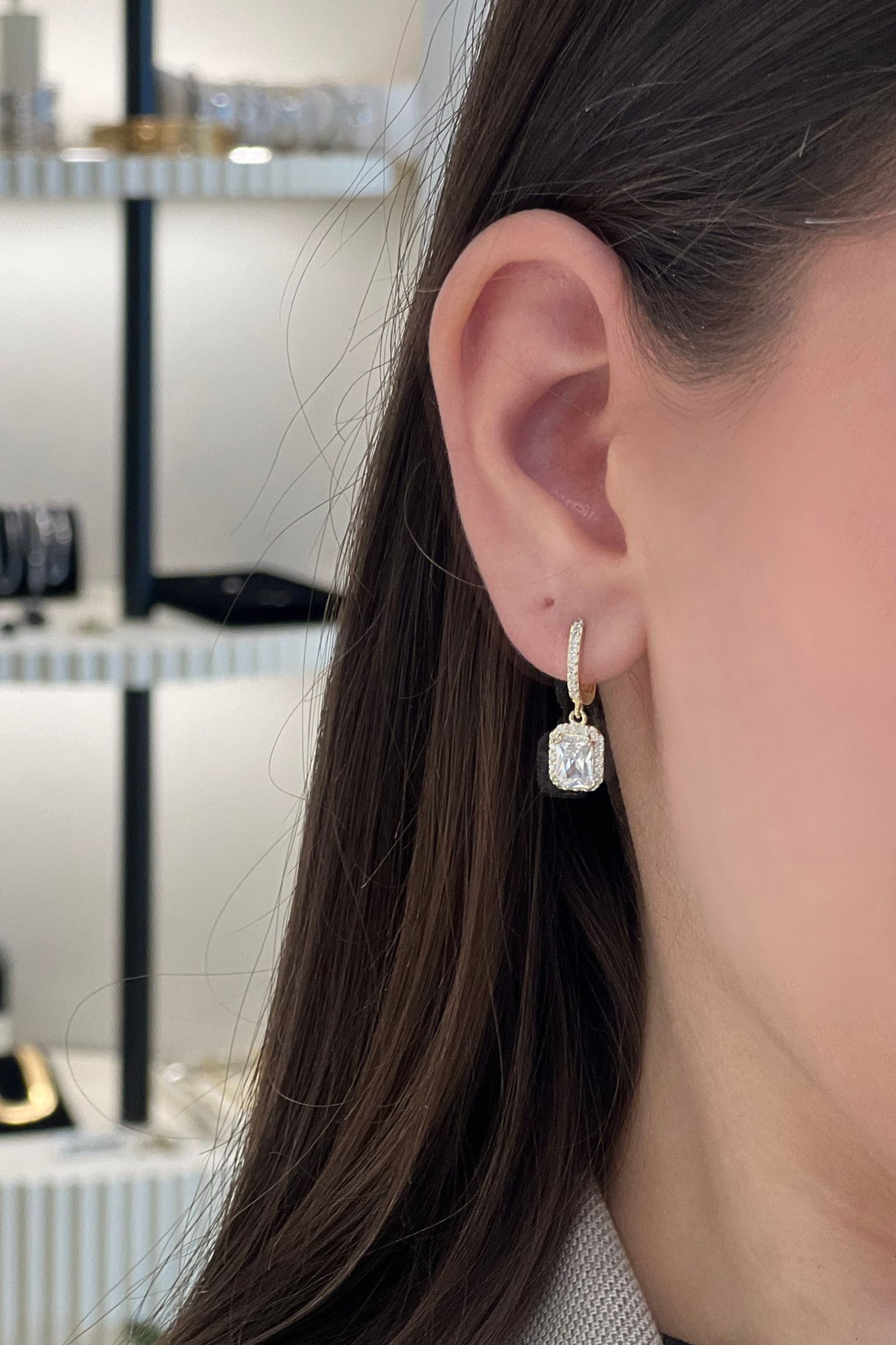 - Σκουλαρίκι με τετράγωνη λευκή πέτρα ζιργκόν που στηρίζεται από μια λεπτή βάση με λαμπερά ζιργκόν