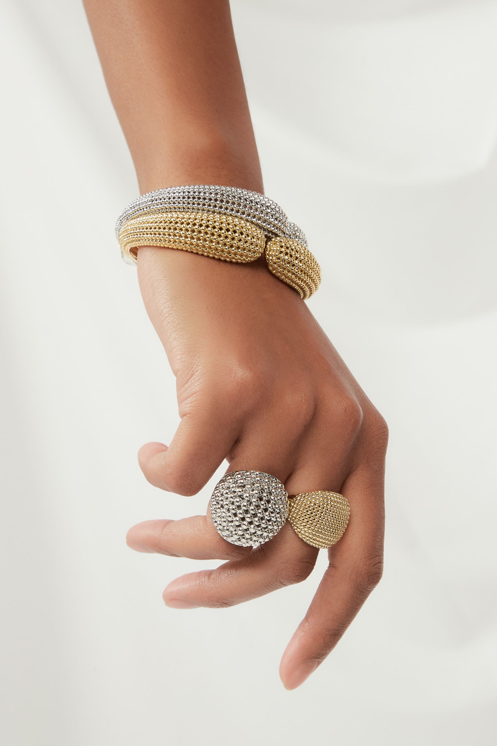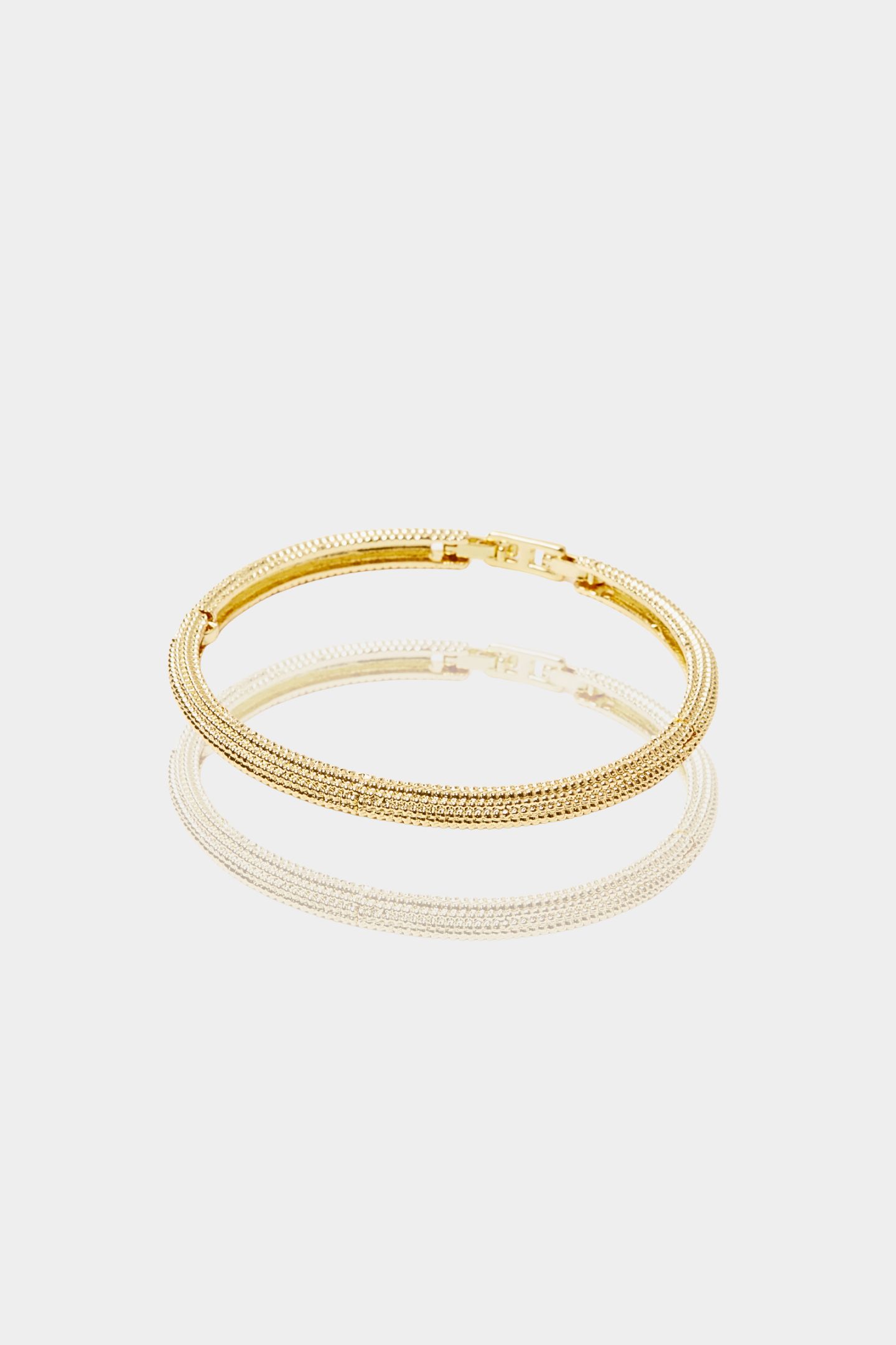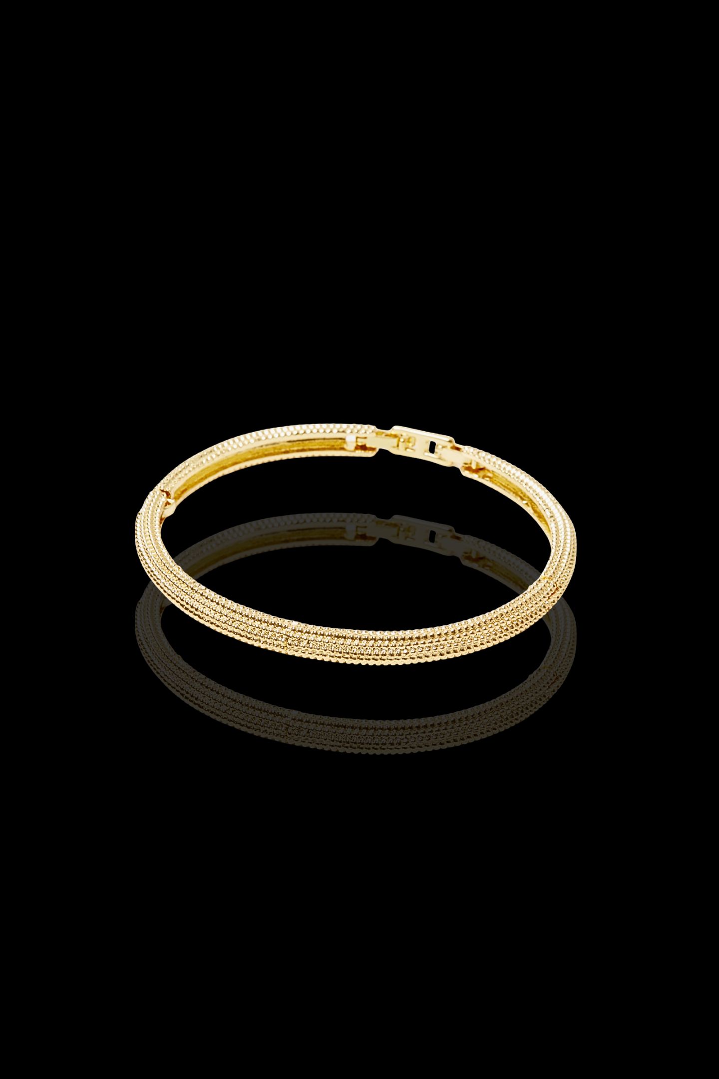 • Βραχιόλι με δύο καμπυλωτά ημικύκλια, διακοσμημένα με ανάγλυφο φινίρισμα μικροσφαιρών που δημιουργούν ένα εντυπωσιακό εφέ υφής και φωτός που δίνει βάθος και ένταση στο κόσμημα