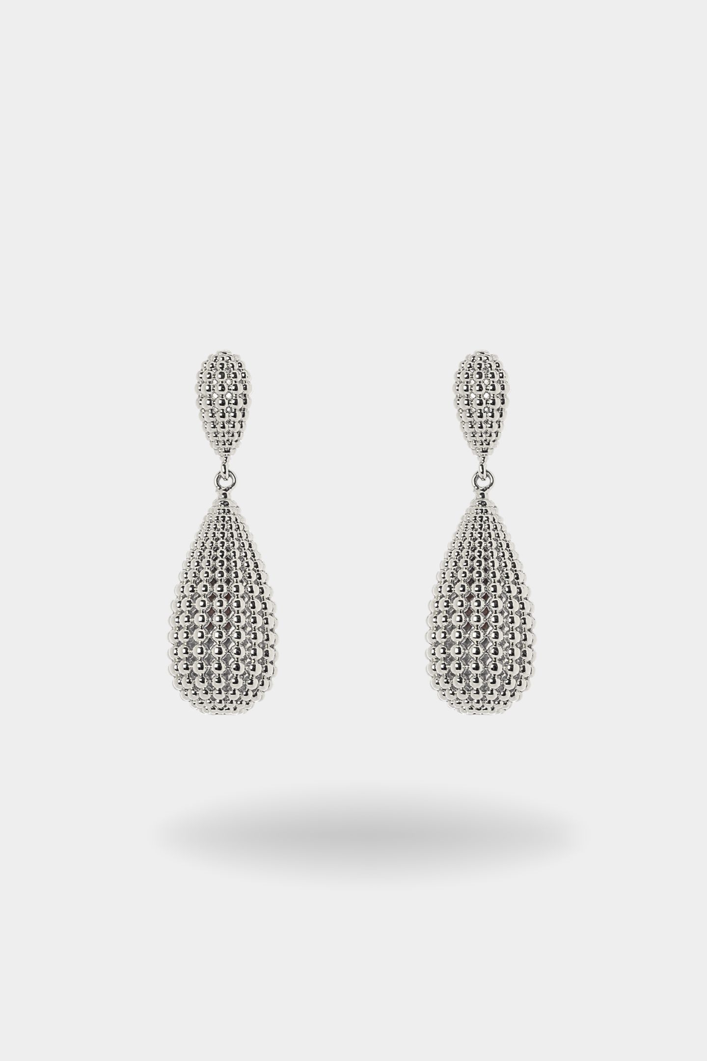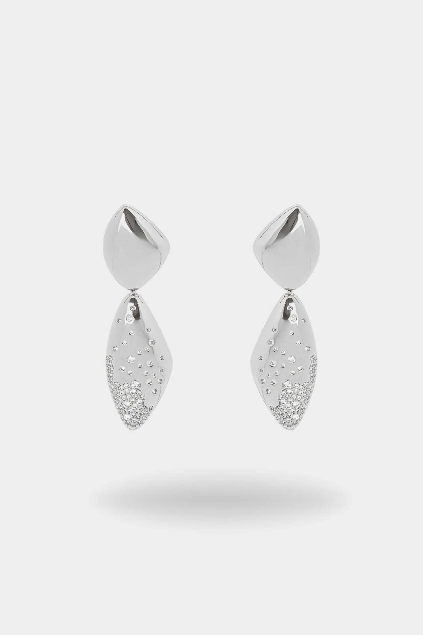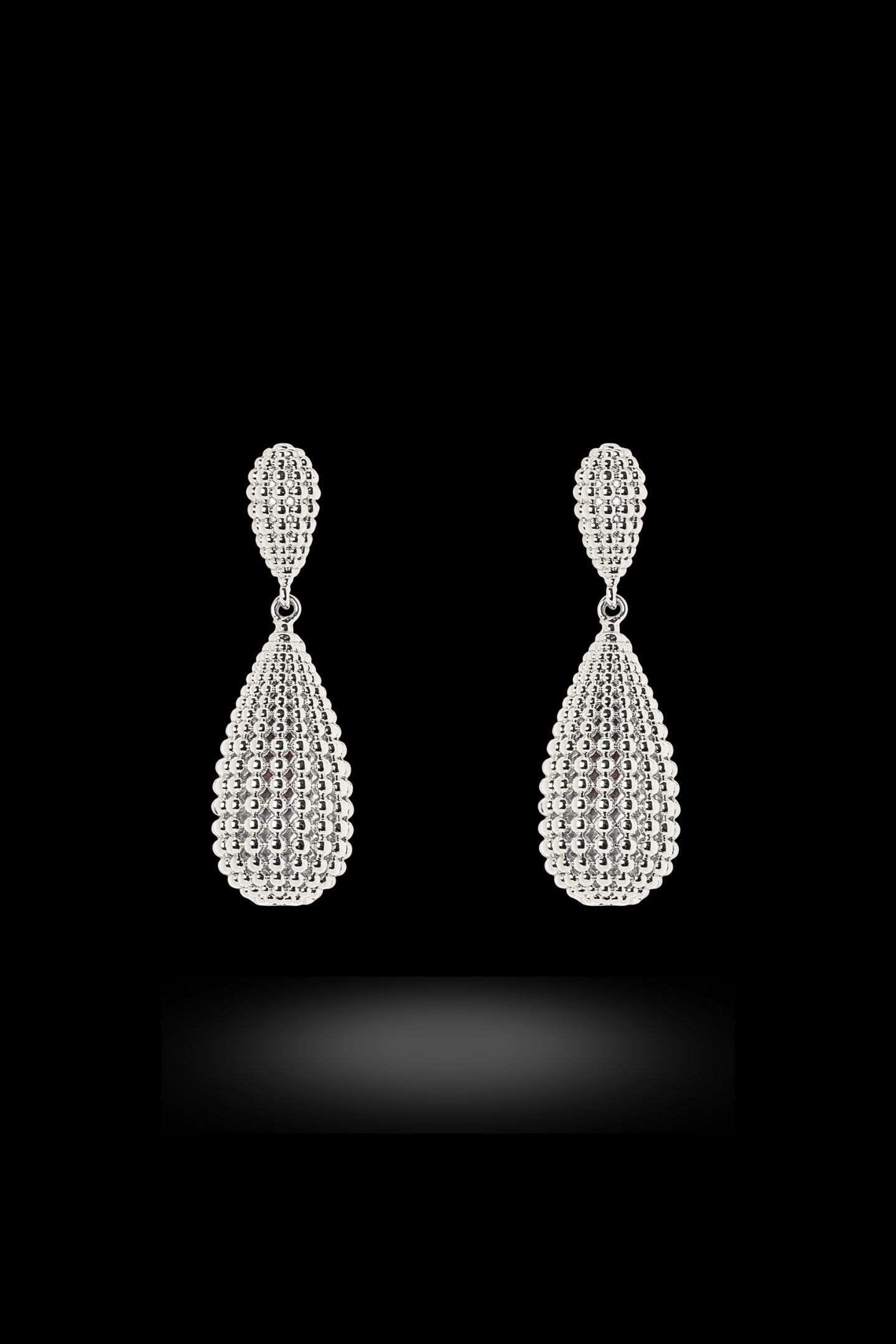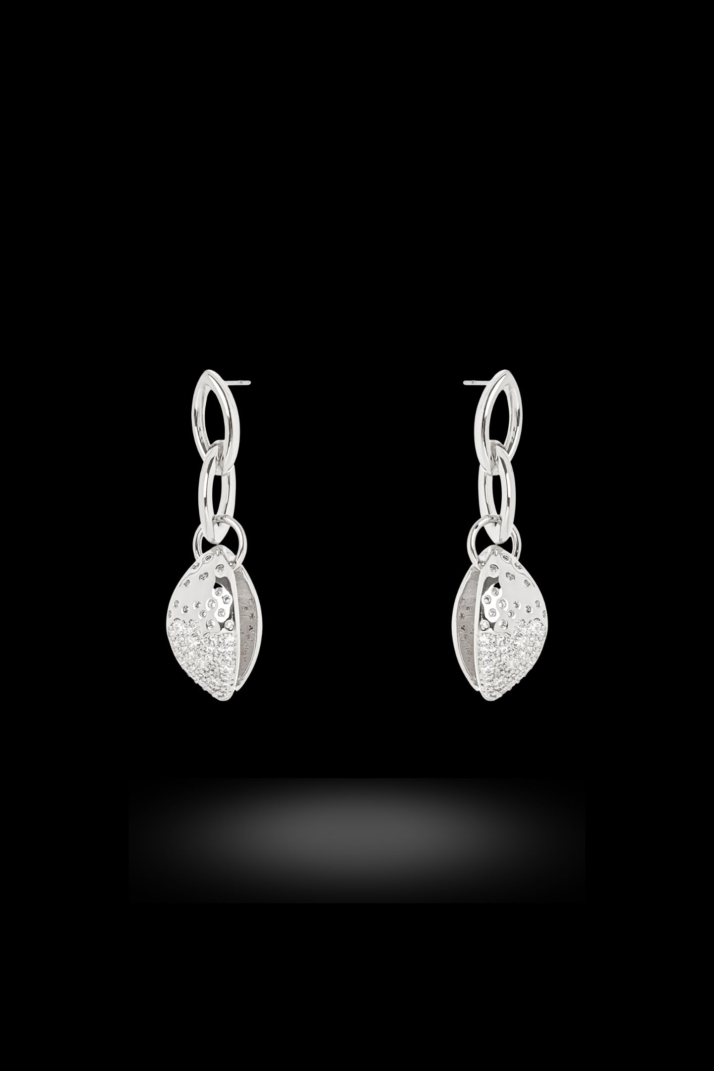 • Σκουλαρίκια με ιδιαίτερο σχέδιο με δύο λαμπερές σταγόνες, διακοσμημένες με μικροσφαιρική υφή που δημιουργούν εντυπωσιακές αντανακλάσεις φωτός