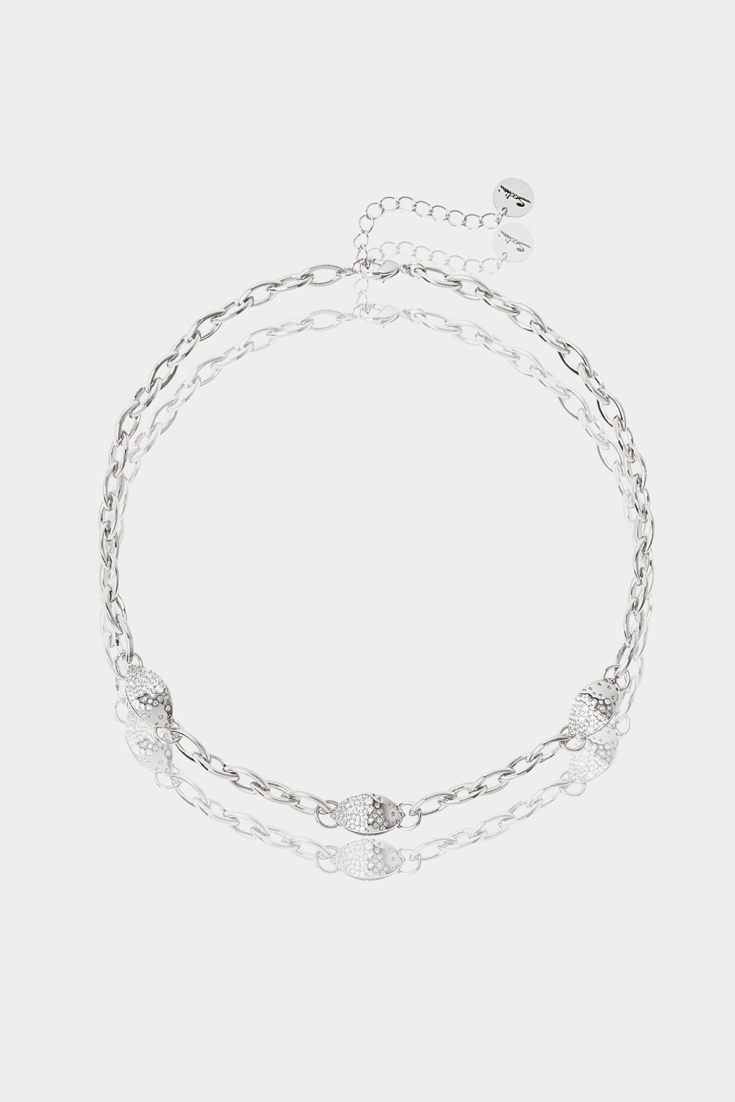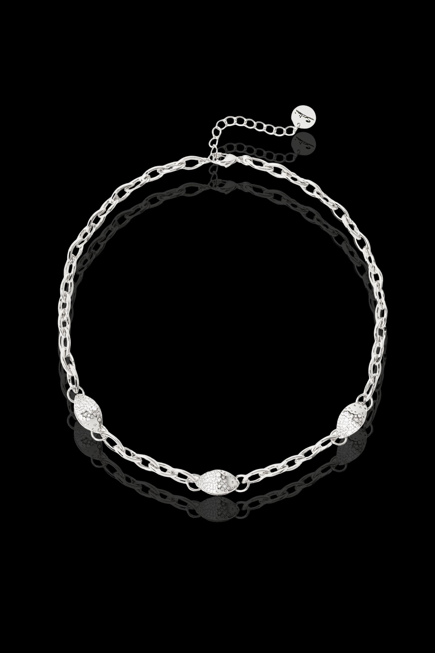 • Κολιέ που διαθέτει μια κομψή αλυσίδα η οποία ενσωματώνει τρία αμυγδαλωτά στοιχεία, διακοσμημένα με λαμπερά κρύσταλλα pavé