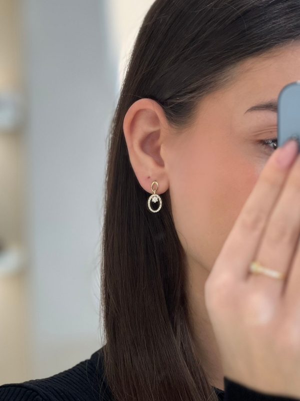 - Το σκουλαρίκι κοσμείται από μια λευκή πέτρα ζιργκόν που κάθεται πάνω στο αυτί και από ένα κρεμαστό οβάλ στοιχείο που κοσμείται από λαμπερά μικρά ζιργκόνια