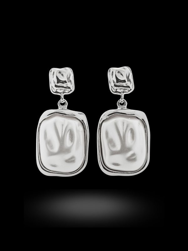 - Κρεμαστό σφυρήλατο σκουλαρίκι με τετράγωνα στοιχεία, λευκό μαργαριτάρι και κούμπωμα πεταλούδα