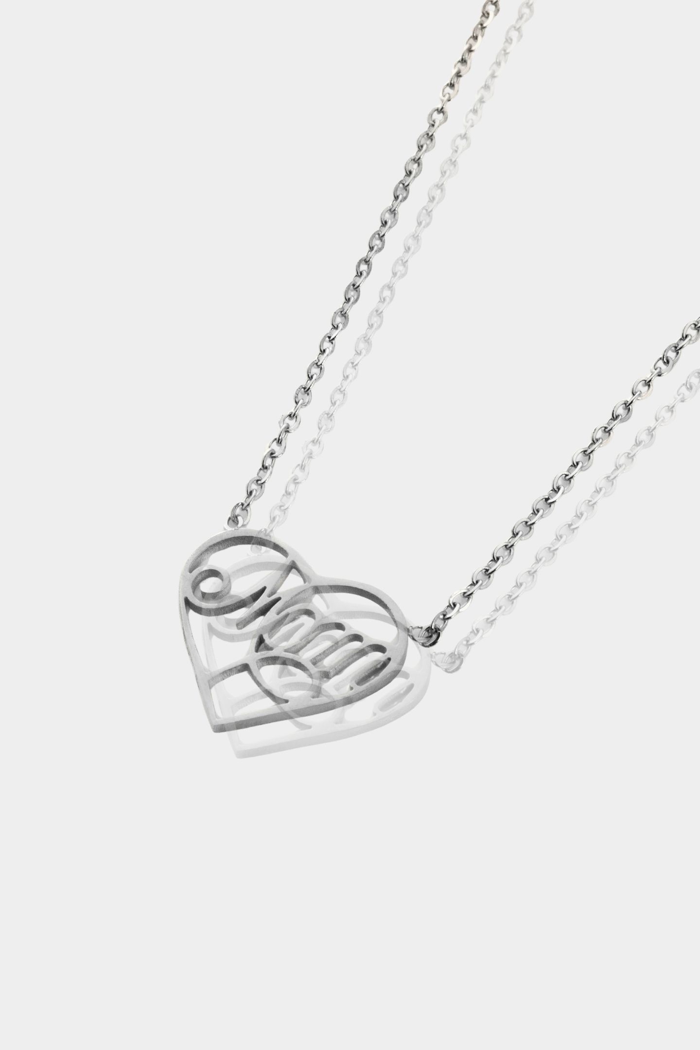 - Κολιέ με λεπτή αλυσίδα και σταθερό κρεμαστό στοιχείο σε σχήμα καρδιάς που αναγράφει τη λέξη mom