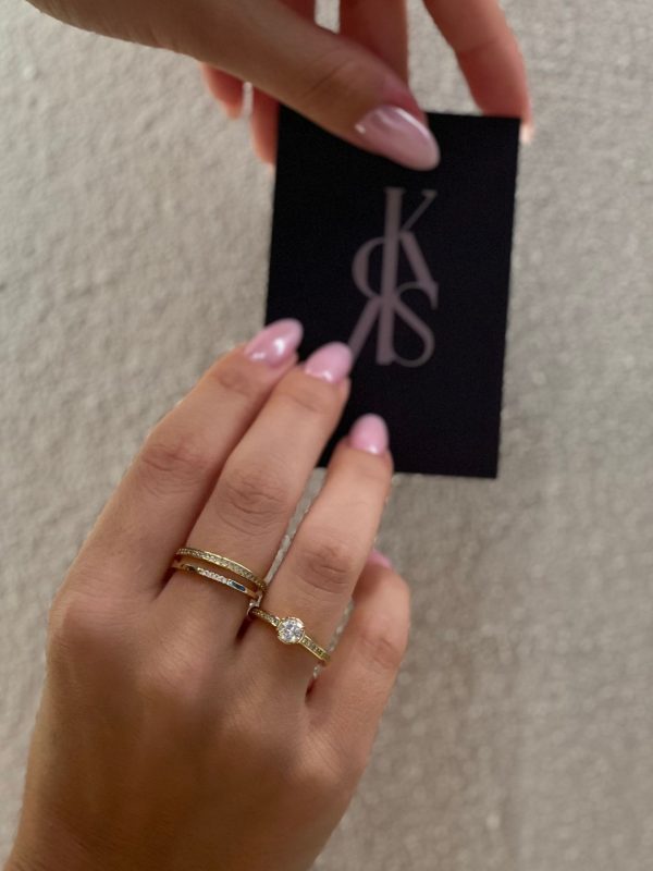 - Λαμπερό κόσμημα με ένα κυκλικό λευκό ζιργκόν στο κέντρο του και μικρότερα πλάγια του δαχτυλιδιού