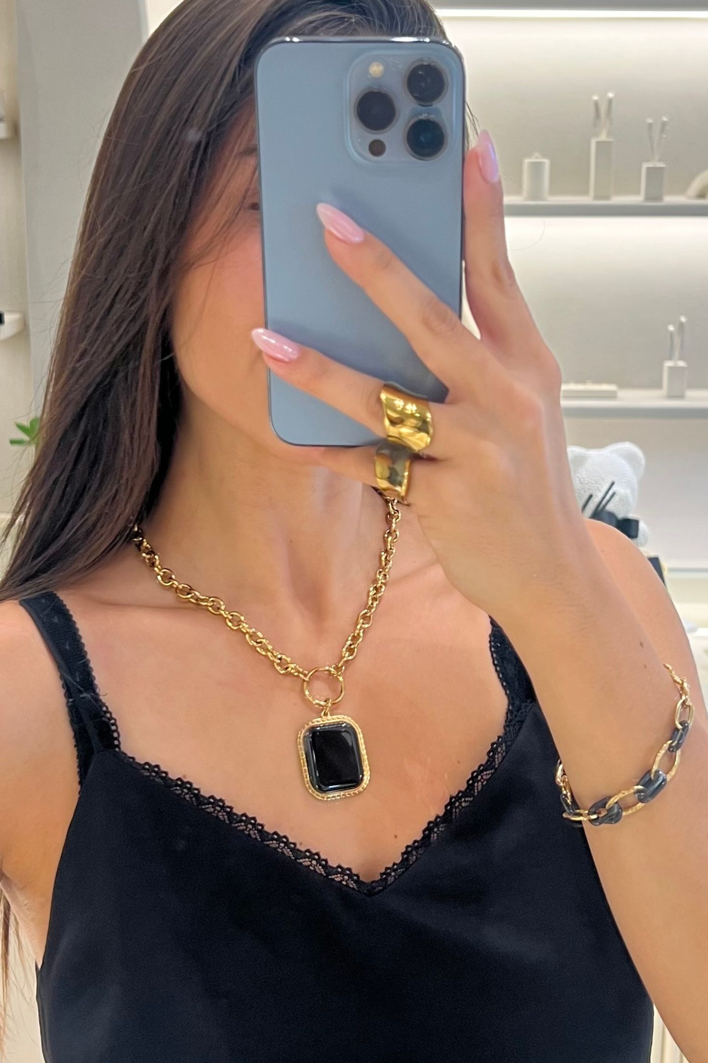- Κολιέ με αλυσίδα και ένα κρεμαστό, επιβλητικό μαύρο στοιχείο στο κέντρο του