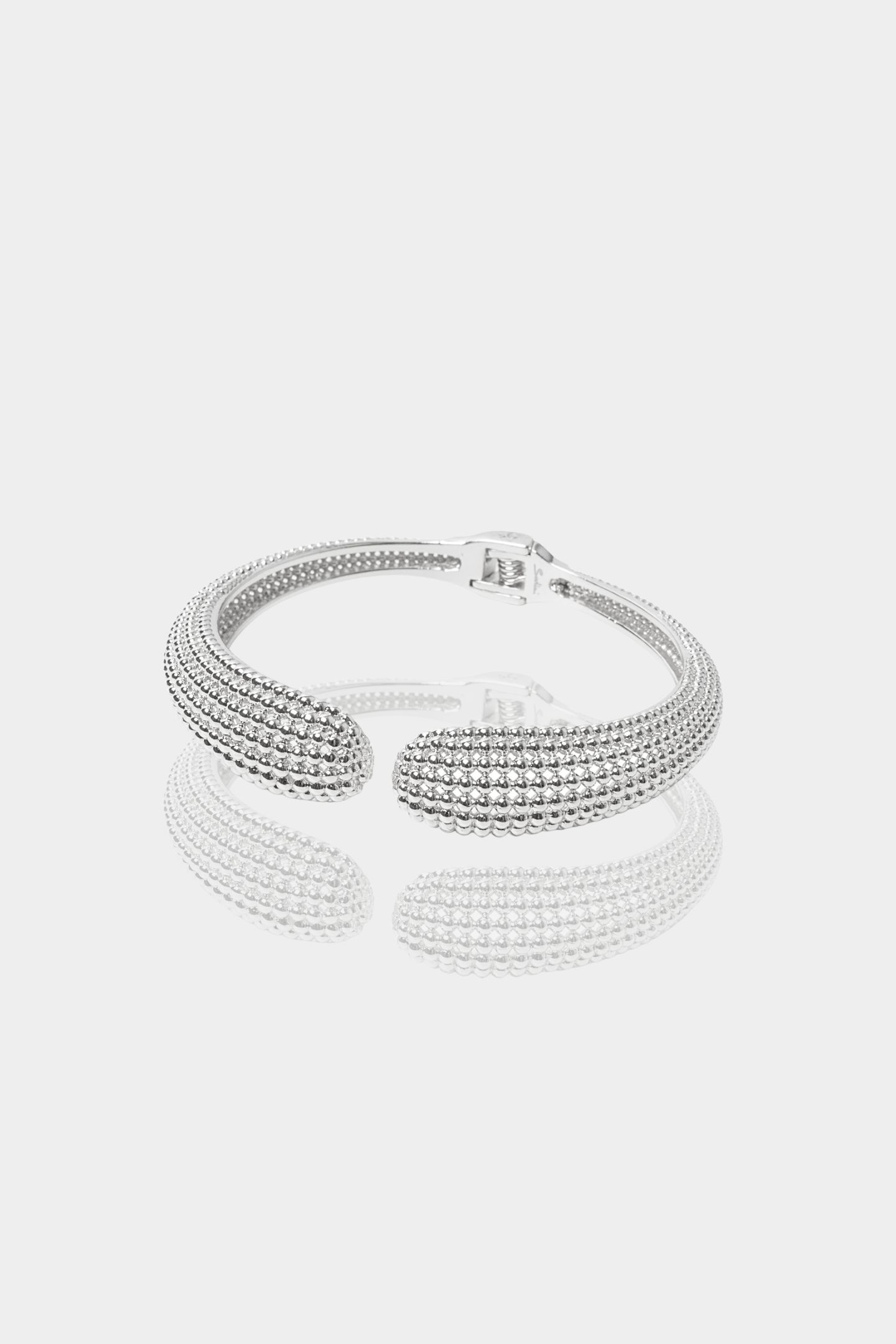 - Εντυπωσιακό βραχιόλι-χειροπέδα με έναν ιδιαίτερο σχεδιασμό με δύο λαμπερά κωνικά ημικύκλια, διακοσμημένα με φινίρισμα μικροσφαιρών