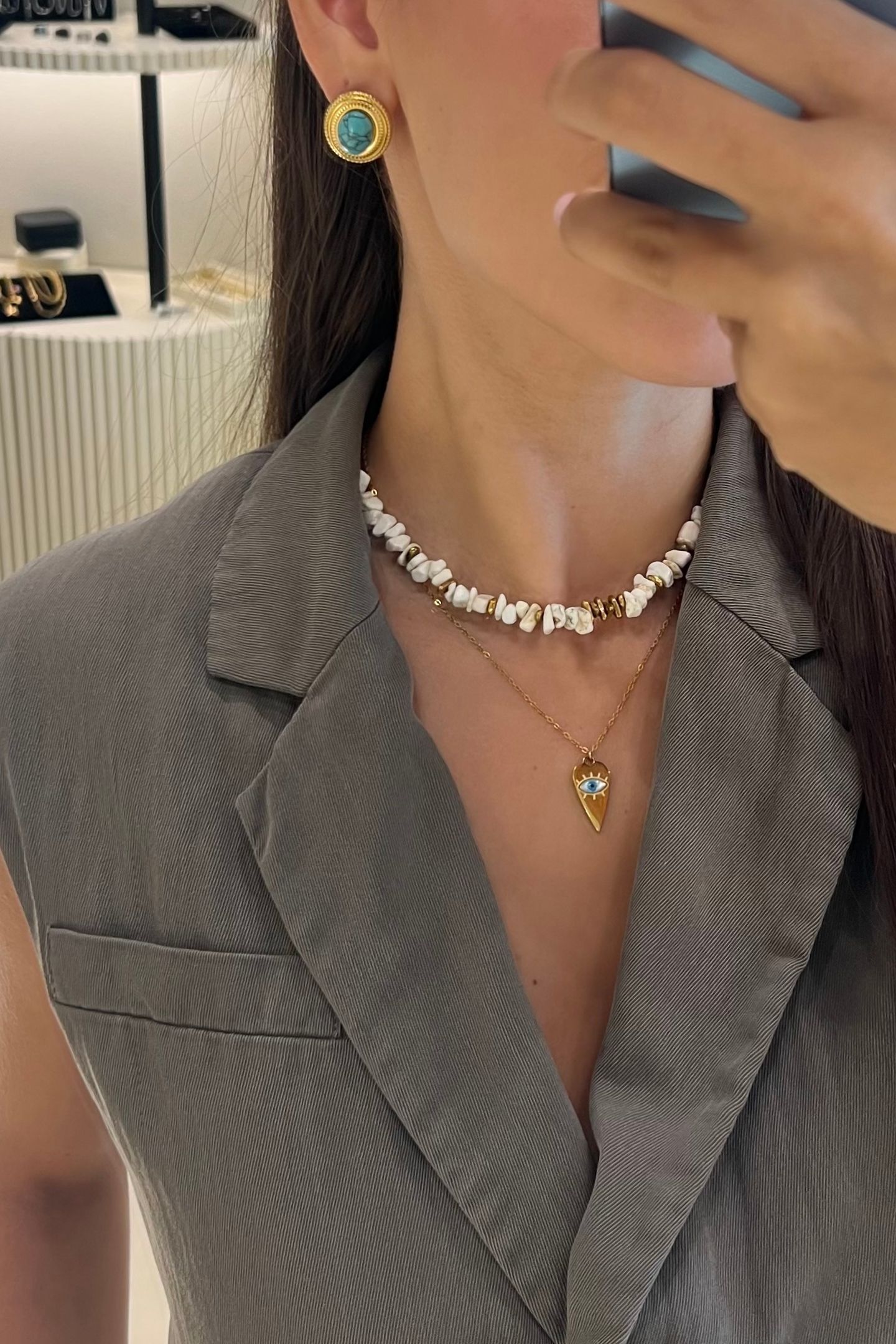 - Κολιέ με λεπτή αλυσίδα και κρεμαστή καρδιά, με γαλάζιο μάτι στο κέντρο