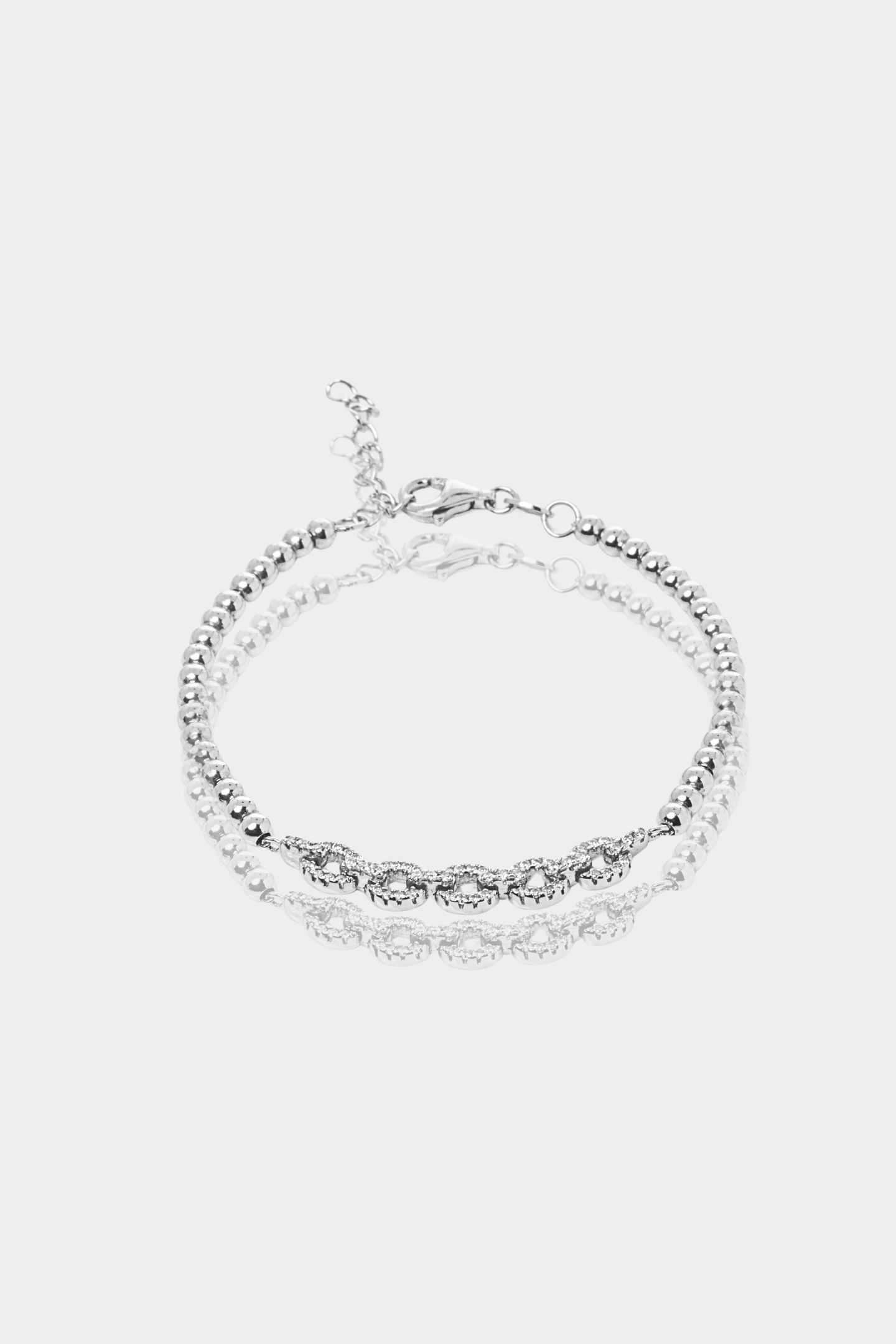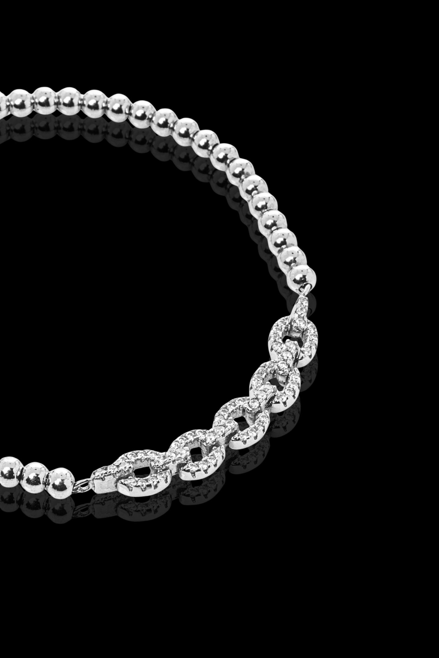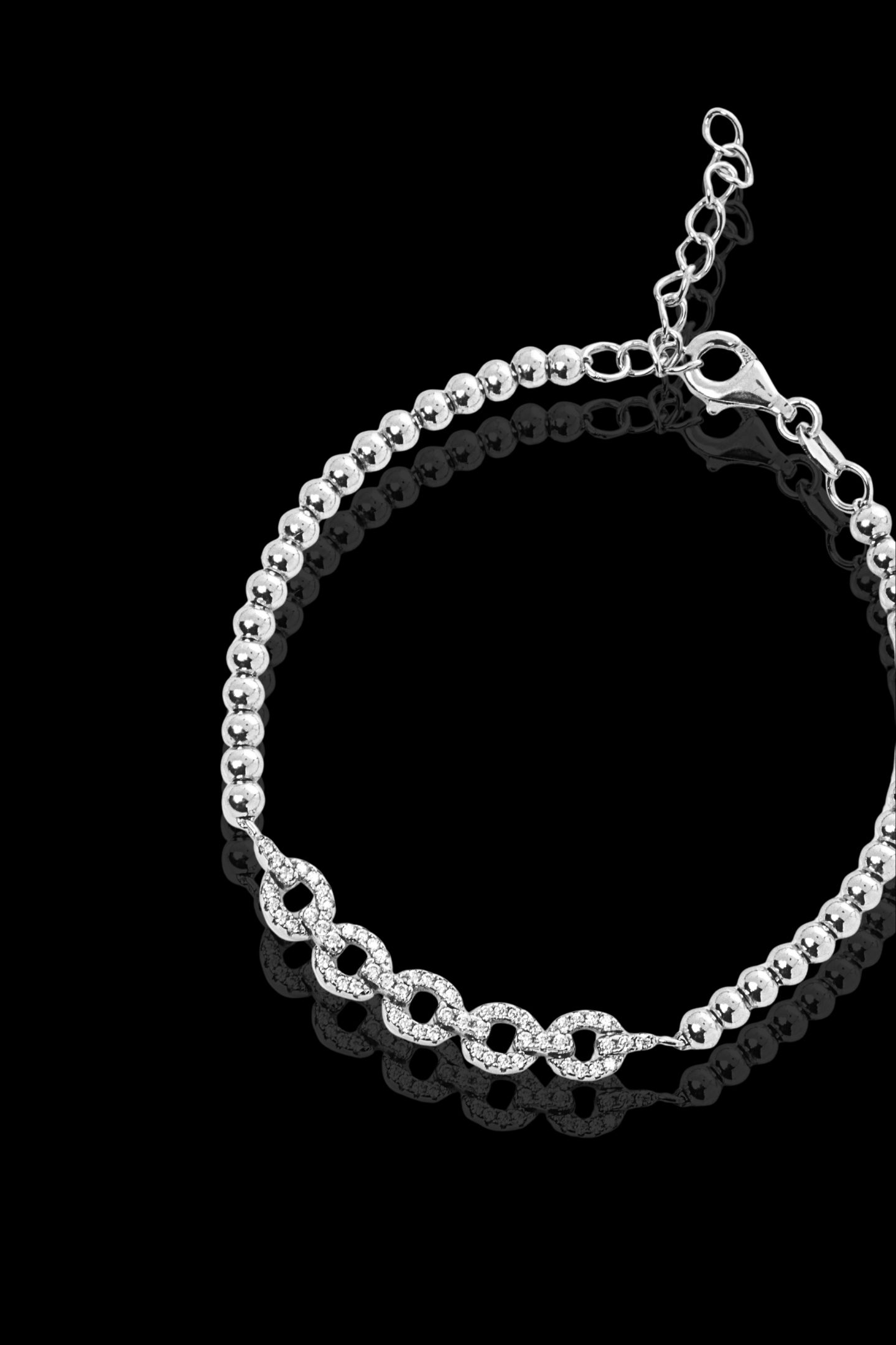 - Βραχιόλι με λεπτές ασημένιες μπιλίτσες και κυκλικά στοιχεία διακοσμημένα με λαμπερά ζιργκόν