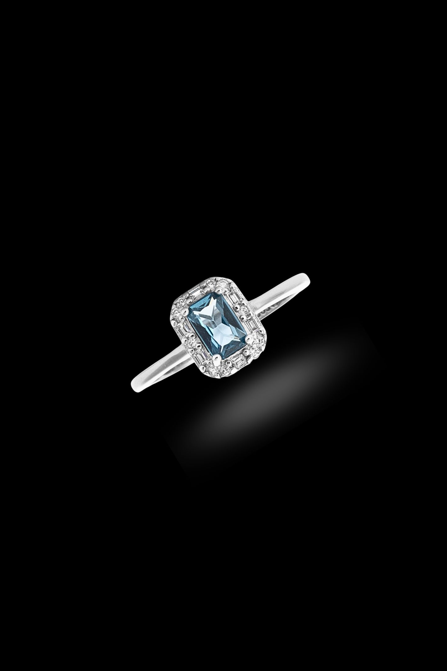 - Λεπτεπίλεπτο δαχτυλίδι, με γαλάζιο ζιργκόν, σε ορθογώνιο σχήμα, στο κέντρο του και μικρότερα λευκά ζιργκόν περιμετρικά