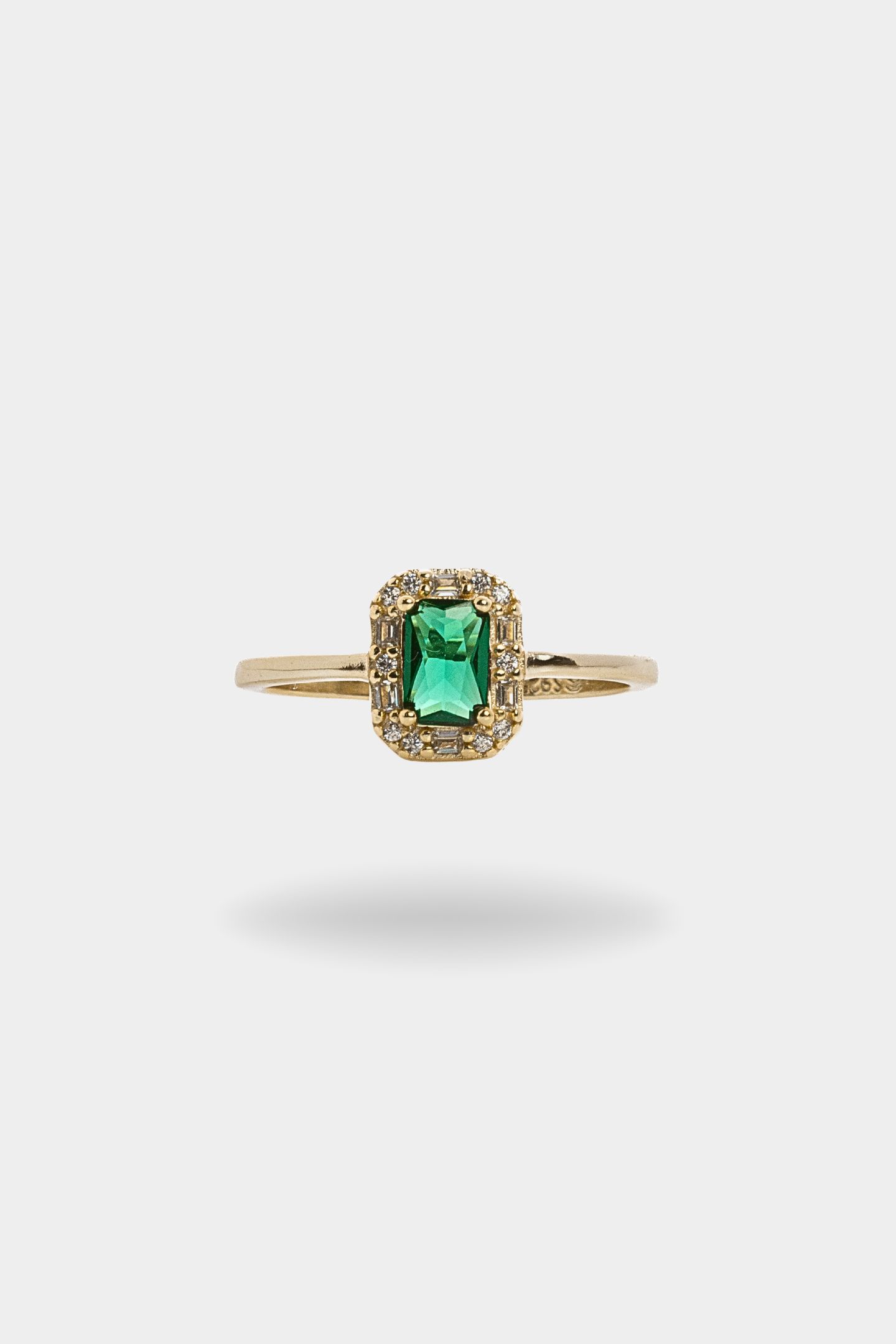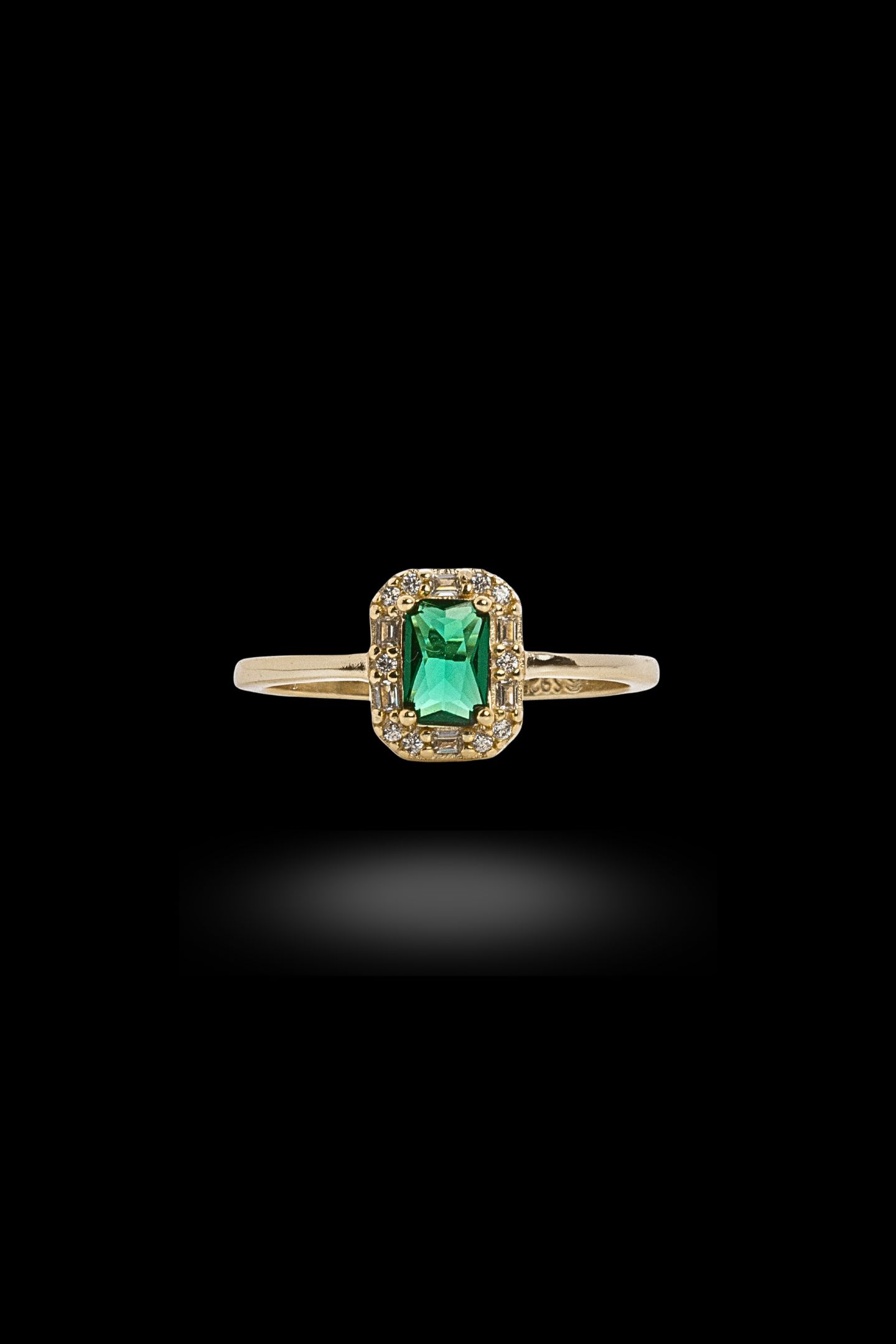 - Λεπτεπίλεπτο δαχτυλίδι, με πράσινο ζιργκόν , σε ορθογώνιο σχήμα, στο κέντρο του και μικρότερα λευκά ζιργκόν περιμετρικά