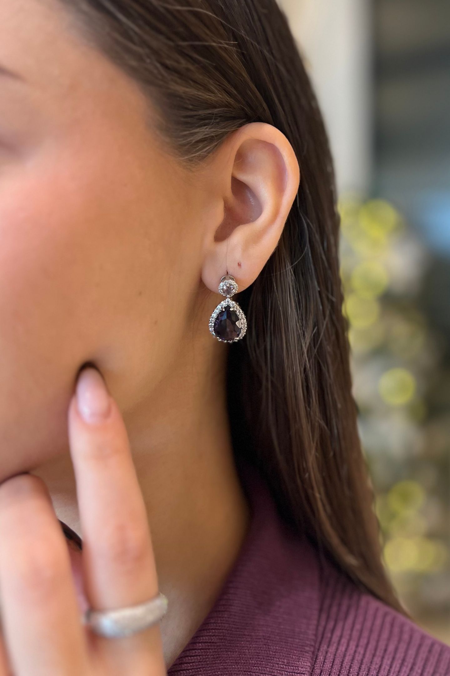 - Κρεμαστό σκουλαρίκι που κοσμείται από μία κεντρική μωβ πέτρα και περιμετρικά από διαφανείς πέτρες ζιρκόνιας