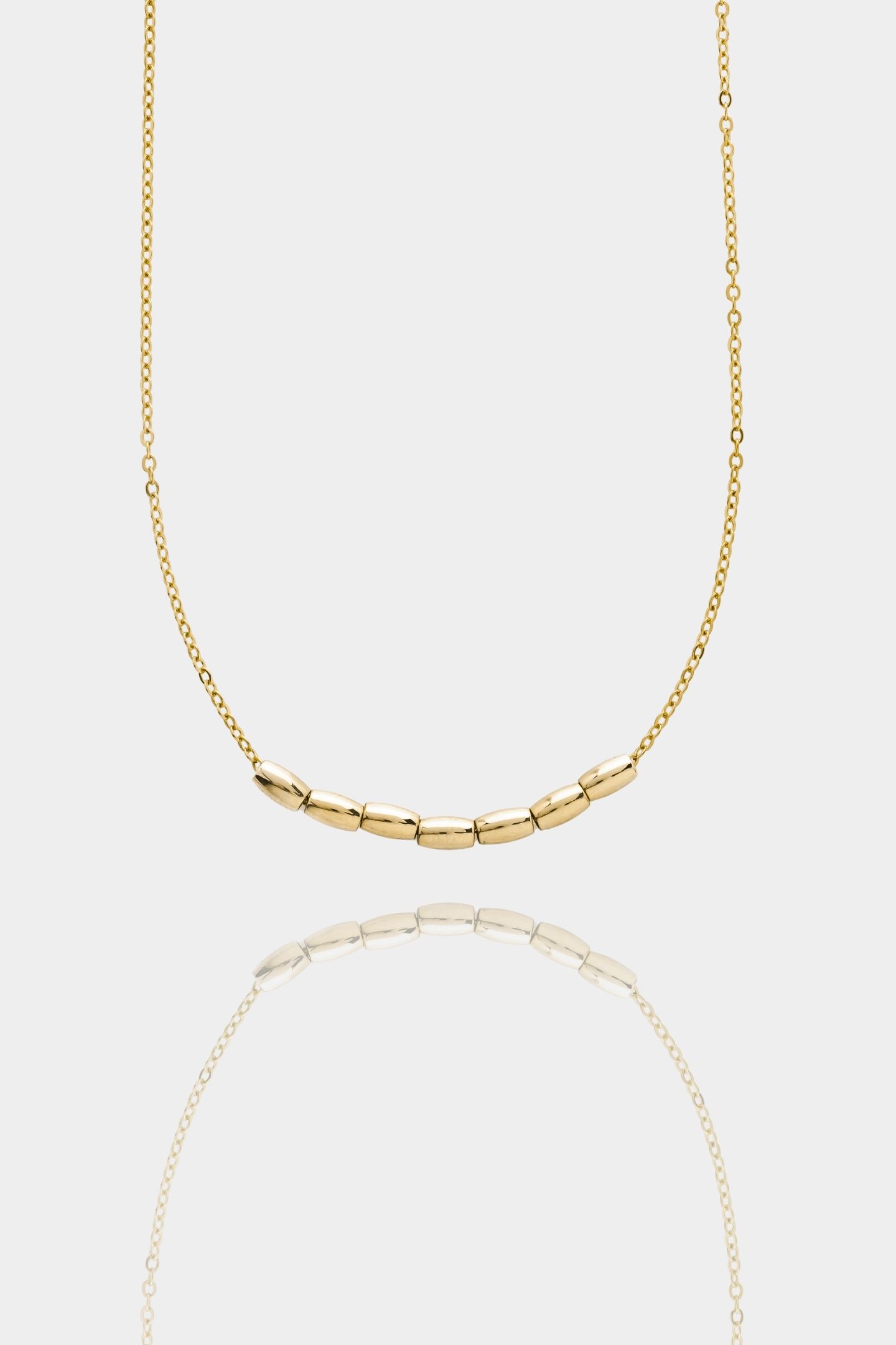 - Κολιέ με λεπτή αλυσίδα και επτά κινούμενα οβάλ στοιχεία που δημιουργούν ένα παιχνίδισμα