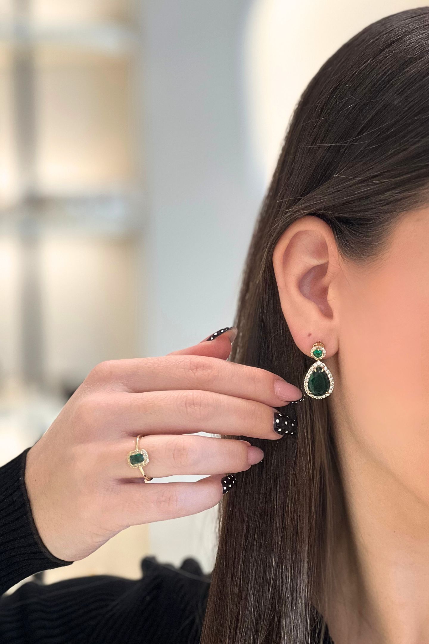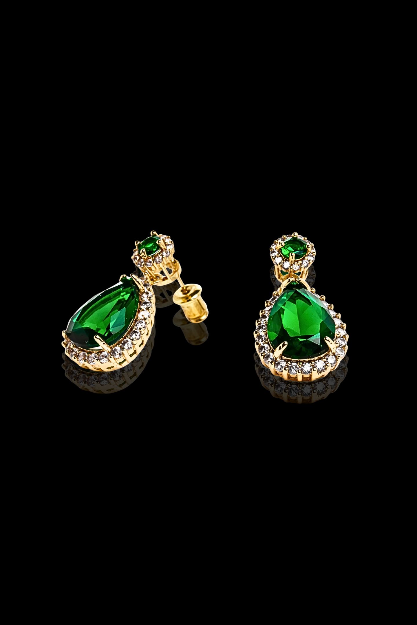 - Κρεμαστό σκουλαρίκι που κοσμείται από μία κεντρική πράσινη πέτρα και περιμετρικά από διαφανείς πέτρες ζιρκόνιας