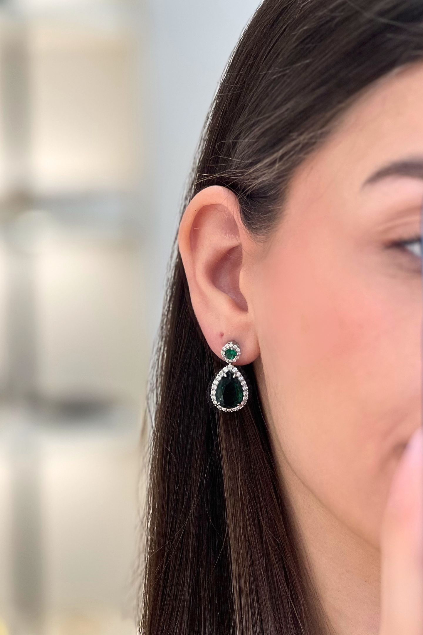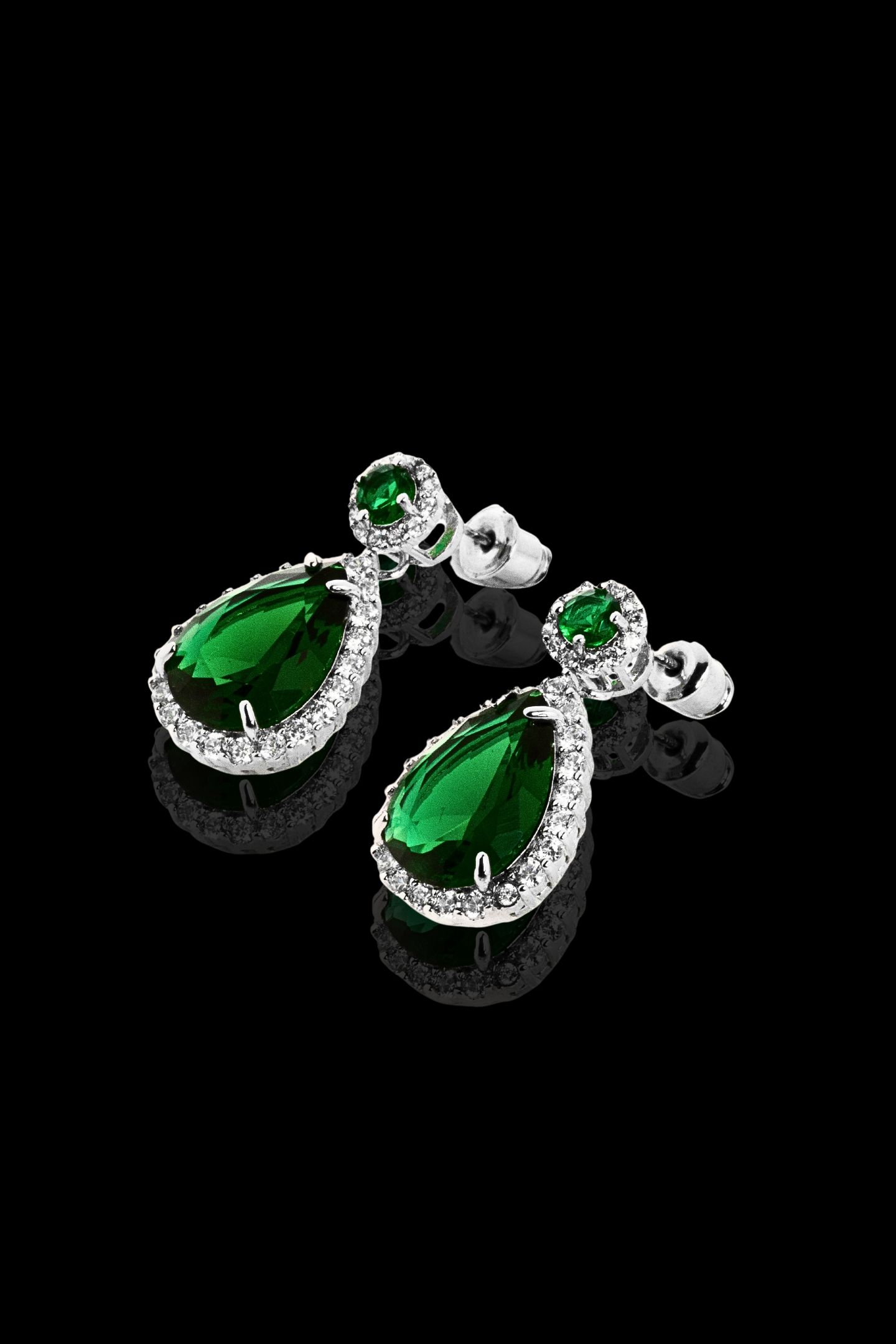 - Κρεμαστό σκουλαρίκι που κοσμείται από μία κεντρική πράσινη πέτρα και περιμετρικά από διαφανείς πέτρες ζιρκόνιας