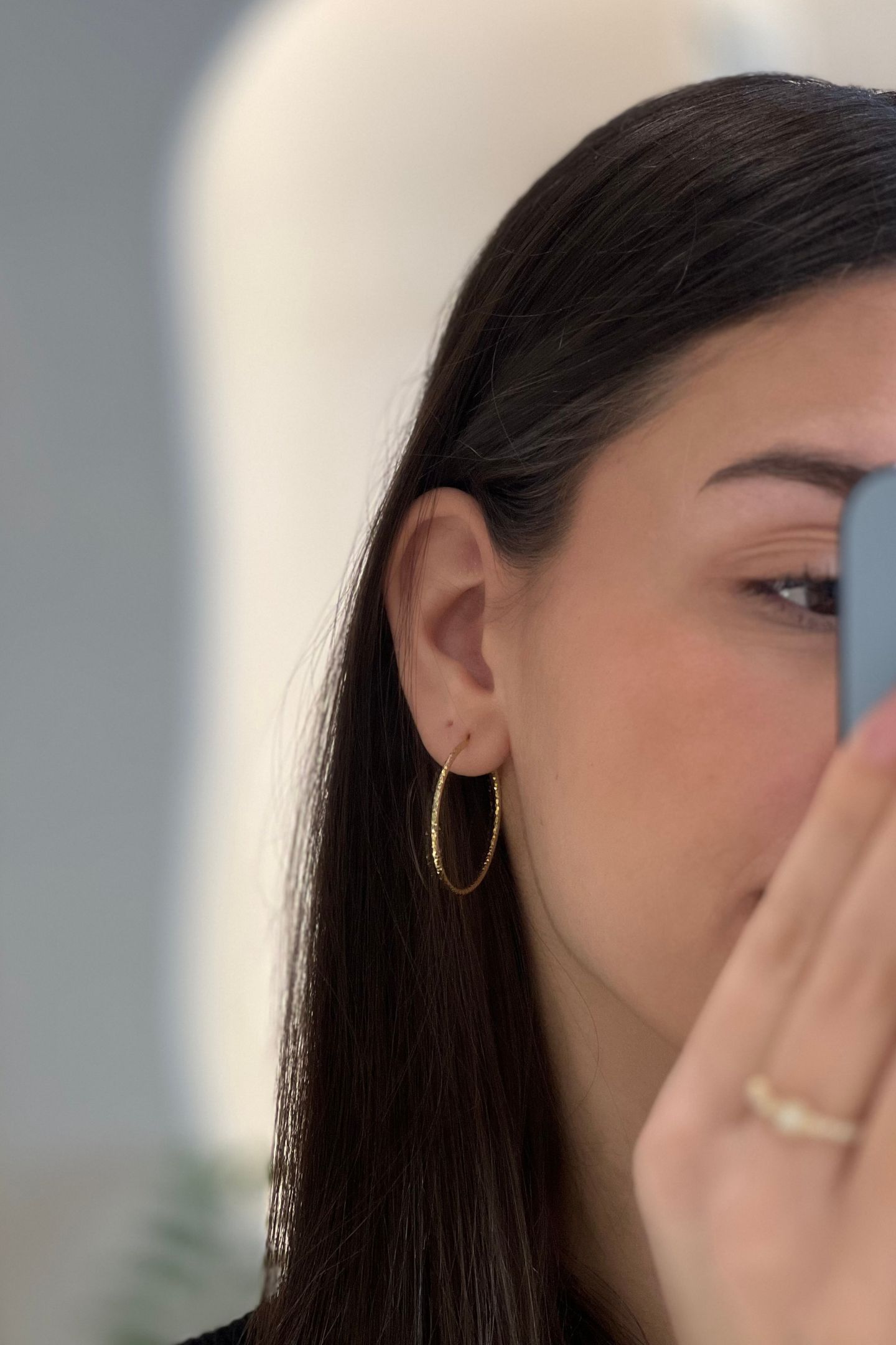 - Λεπτός, μεσαίου μεγέθους κρίκος(3,5cm) αλλά με εμφανές σχέδιο που προσθέτει μια διακριτική λάμψη στο πρόσωπο