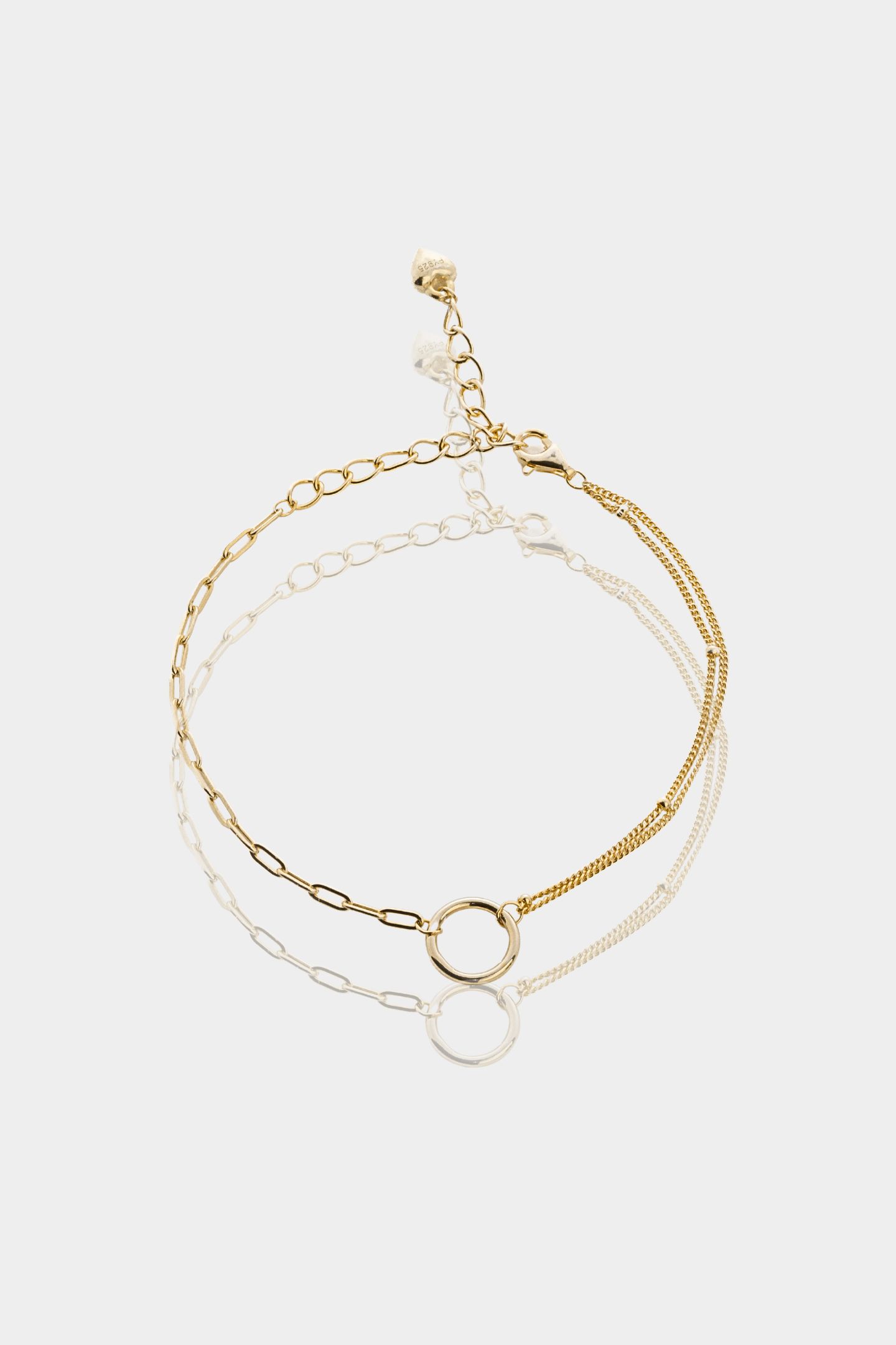 - Το μισό του κοσμήματος αποτελείται από διπλή αλυσίδα που καταλήγει σε ένα κεντρικό κυκλικό στοιχείο. Το υπόλοιπο μισό είναι μια αλυσίδα με ενωμένα μεταξύ τους ορθογώνια στοιχεία δημιουργώντας μια κομψή αντίθεση