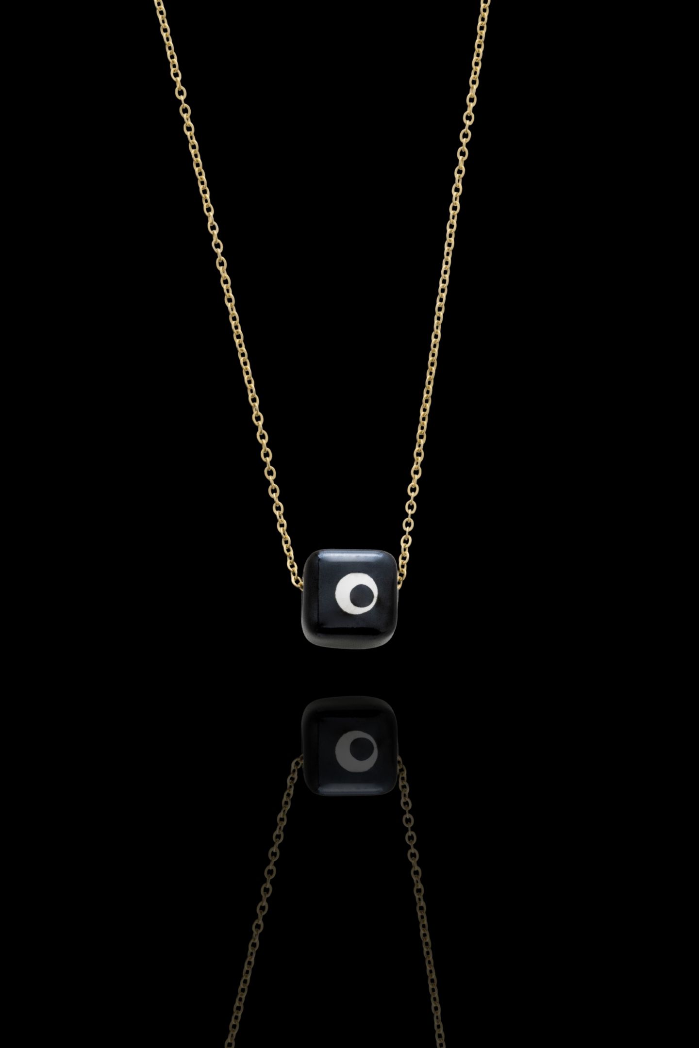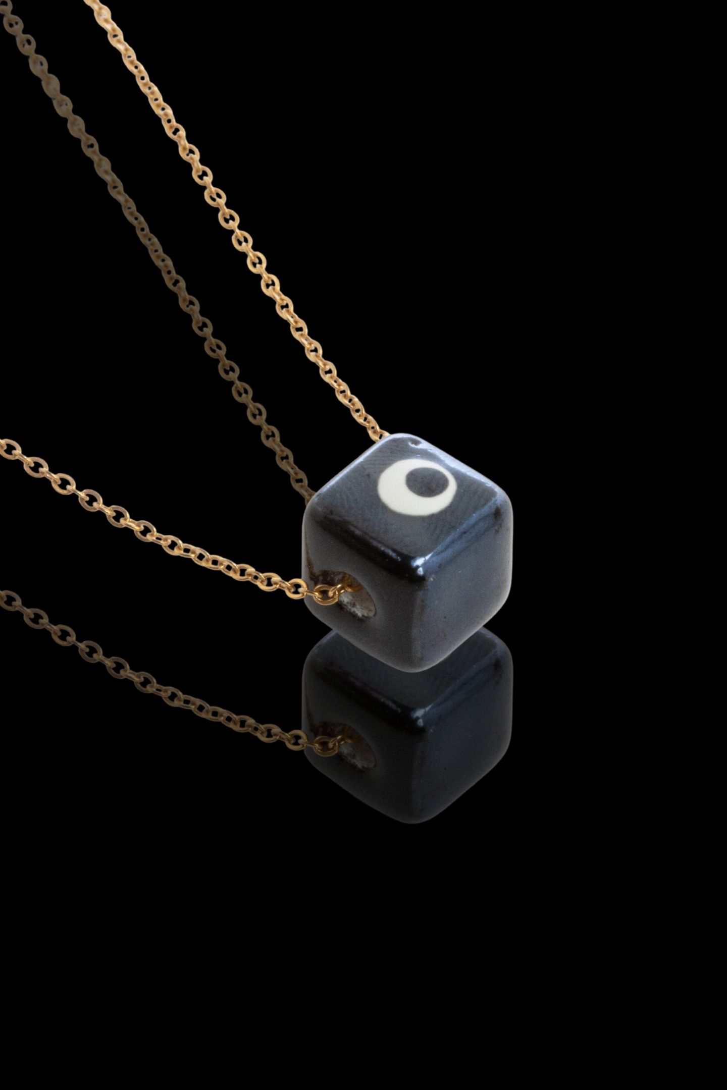 - Κολιέ με λεπτή αλυσίδα και κυβικό κρεμαστό στοιχείο-μάτι με επιχρύσωση 24k
