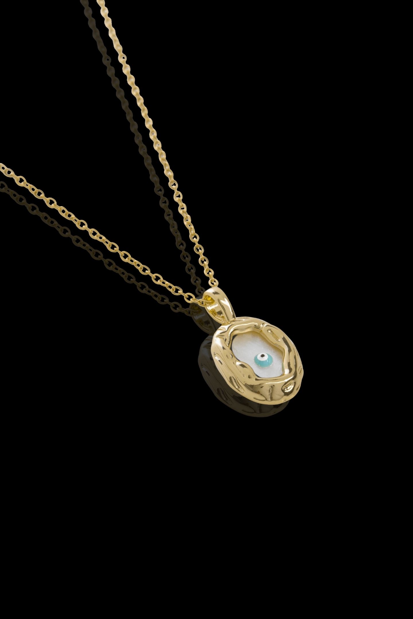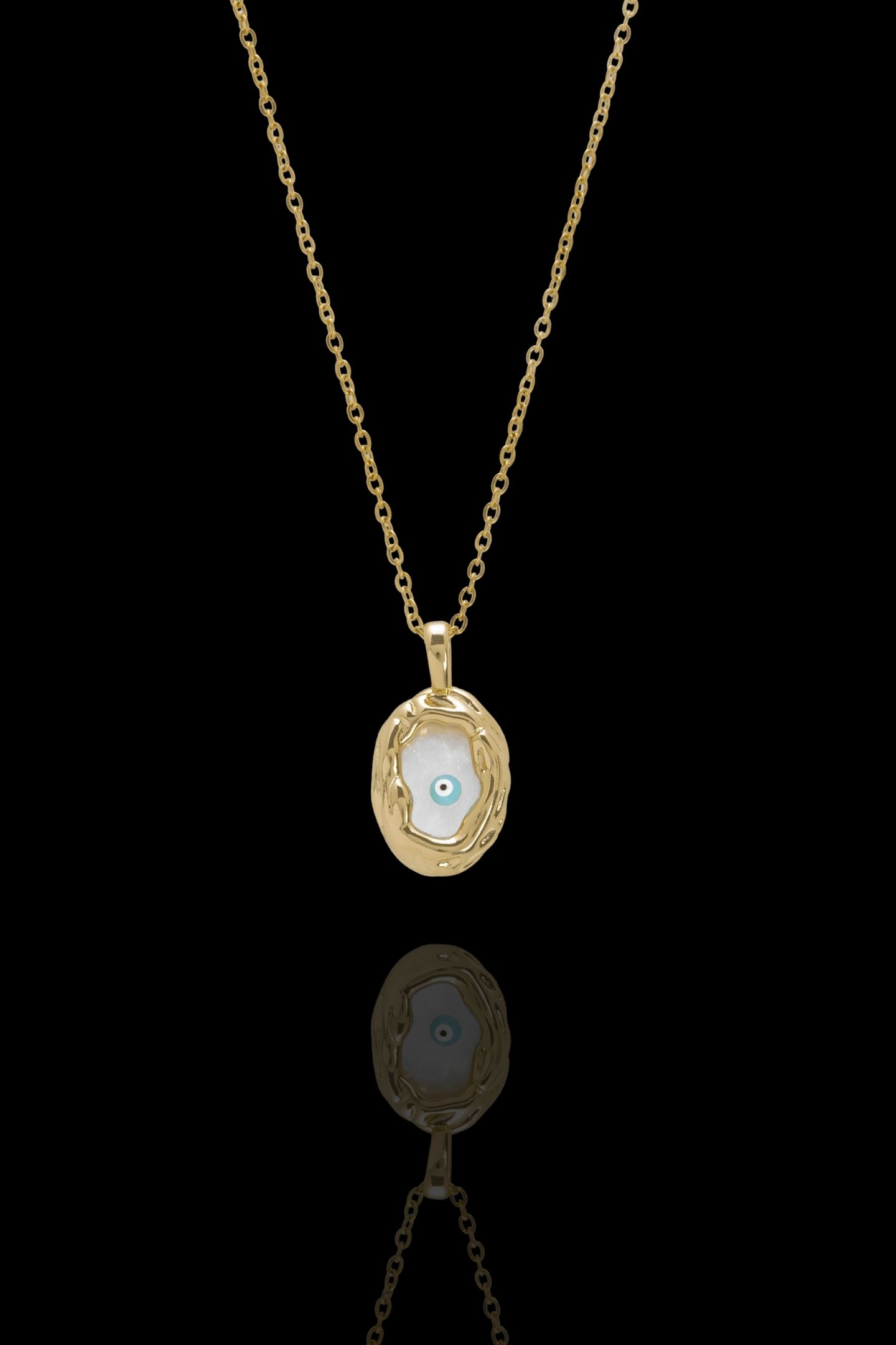 - Κολιέ με λεπτή αλυσίδα με επιχρύσωση 24k και κρεμαστό λευκό στοιχείο, με γαλάζιο μάτι στο κέντρο