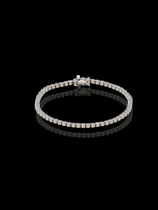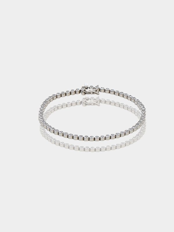- Ασημένιο βραχιόλι ριβιέρα με κυκλικές πέτρες ζιργκόν που αντανακλούν το φως σε κάθε κίνηση, προσφέροντας εκθαμβωτική λάμψη