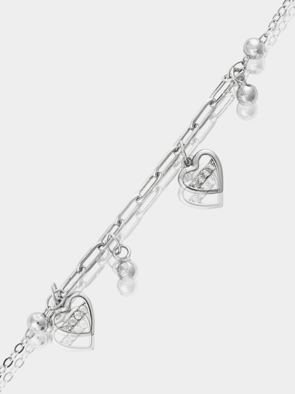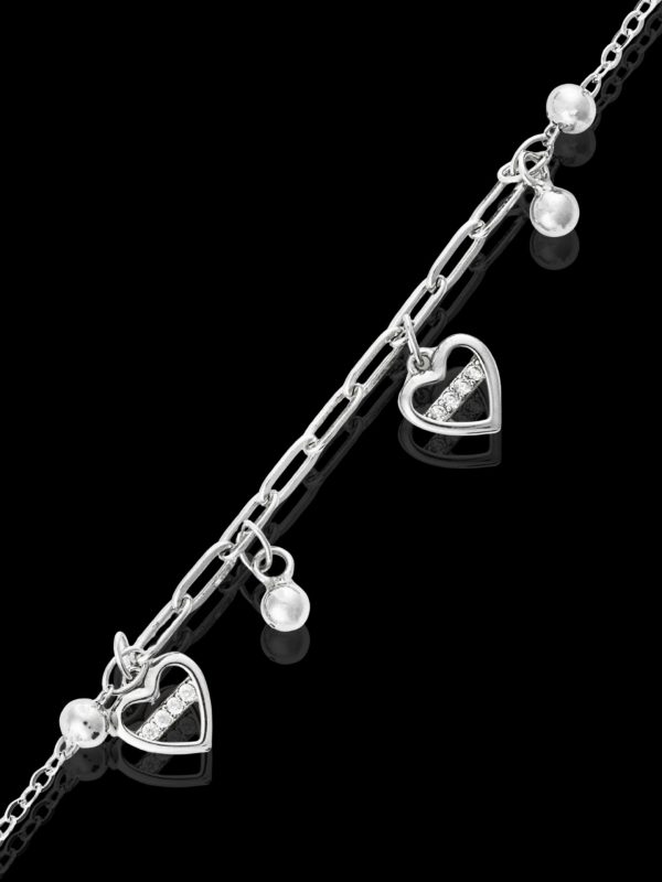 - Βραχιόλι με λεπτή αλυσίδα διακοσμημένη με μικρές ασημένιες μπιλίτσες και κινούμενα, κρεμαστά στοιχεία σε σχήμα καρδιάς