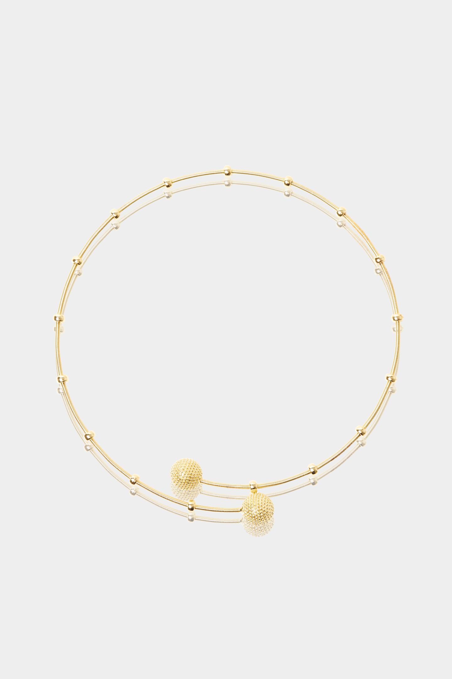 - Κολιέ με ιδιαίτερο σχεδιασμό με χρυσό νήμα που αναδεικνύεται μέσα από εντυπωσιακούς κρίκους και δύο φωτεινές μικροσφαίρες στα άκρα