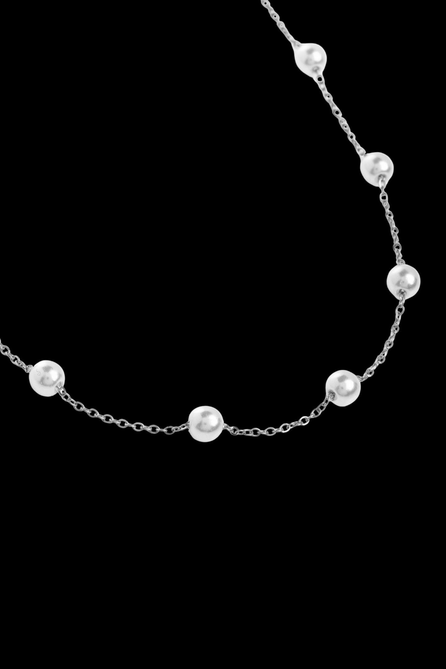 - Κολιέ με λευκά μαργαριτάρια τοποθετημένα σταθερά πάνω σε ασημί αλυσίδα