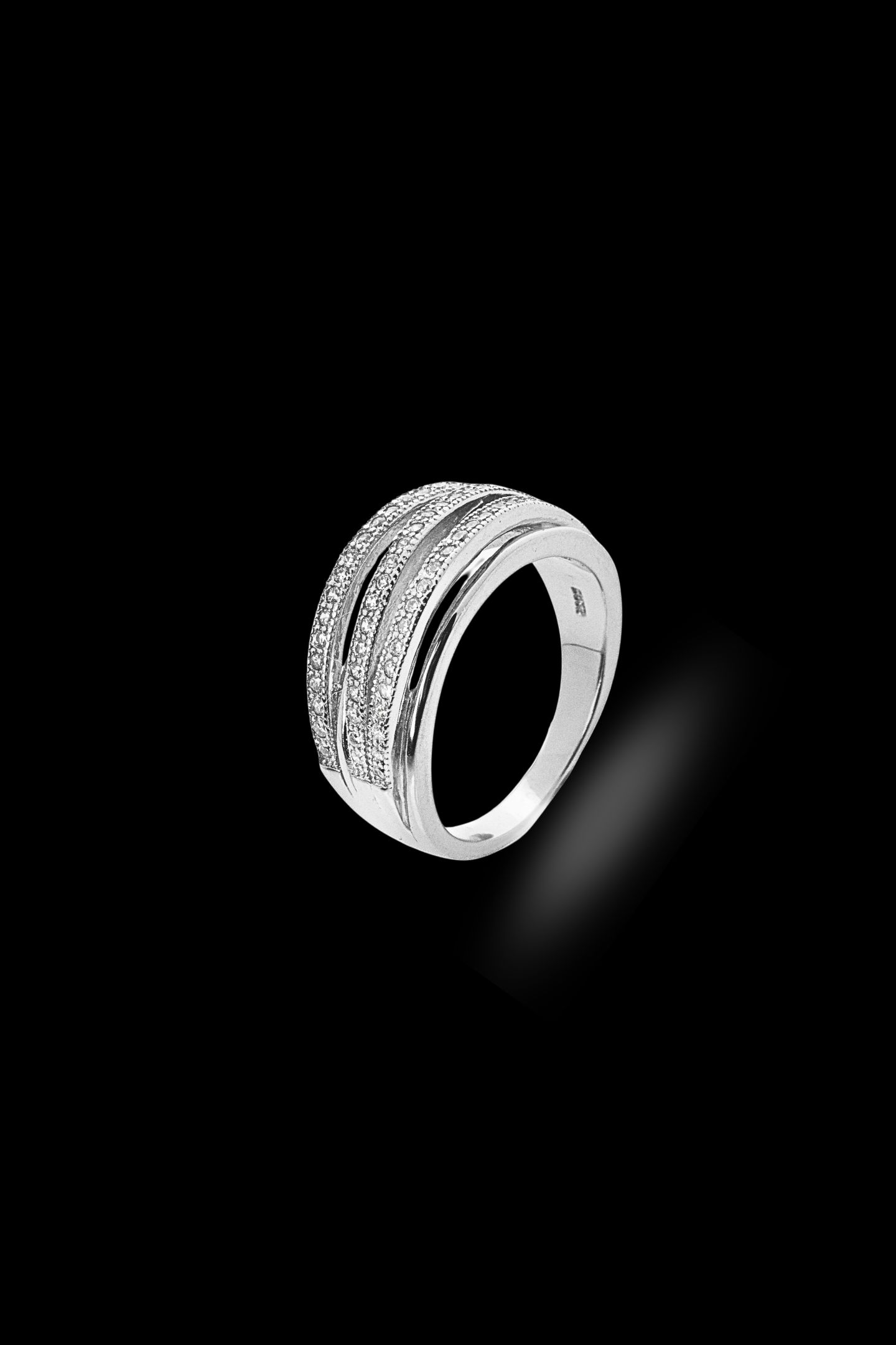 - Δαχτυλίδι με τρεις σειρές λευκά λαμπερά ζιργκόν και δύο ασύμμετρες σκέτες